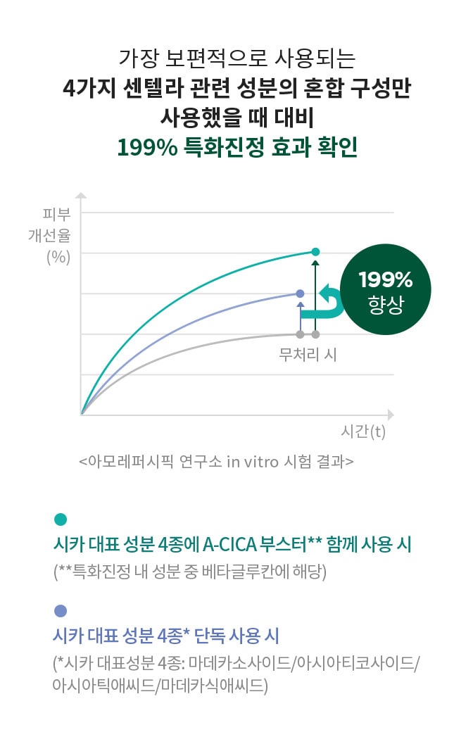 시카 대표성분 4종*만 사용했을 때 보다 199%의 자생 효능 확인(아모레퍼시픽 연구소 in vitro 시험 결과)* 가장 보편적으로 사용되는 시카 성분 4종: