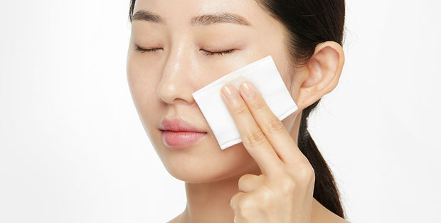 화장솜에 토너를 적당량 적셔 안쪽에서 바깥쪽으로 가볍게 닦아 냅니다.
