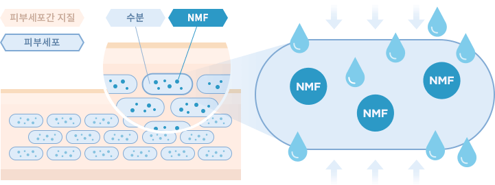 피부 속에 들어있는 천연보습인자 NMF 는 주변에 있는 수분을 강하게 끌어당겨 피부 수분을 유지합니다.