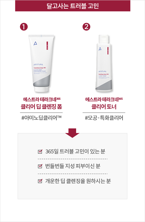 테라크네365 클리어 라인은 트러블 고민에 따른 맞춤 클렌징을 제안하는 특화 클렌징 라인입니다.